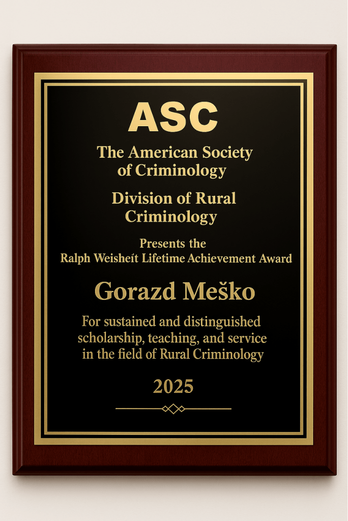 Prof. dr. Gorazd Meško je prejel nagrado za življenjsko delo Oddelka za ruralno kriminologijo Ameriškega kriminološkega združenja. Podelitev je potekala v okviru konference Ameriškega kriminološkega združenja (American Society of Criminology), ki poteka v Washingtonu DC, Združenih državah Amerike.